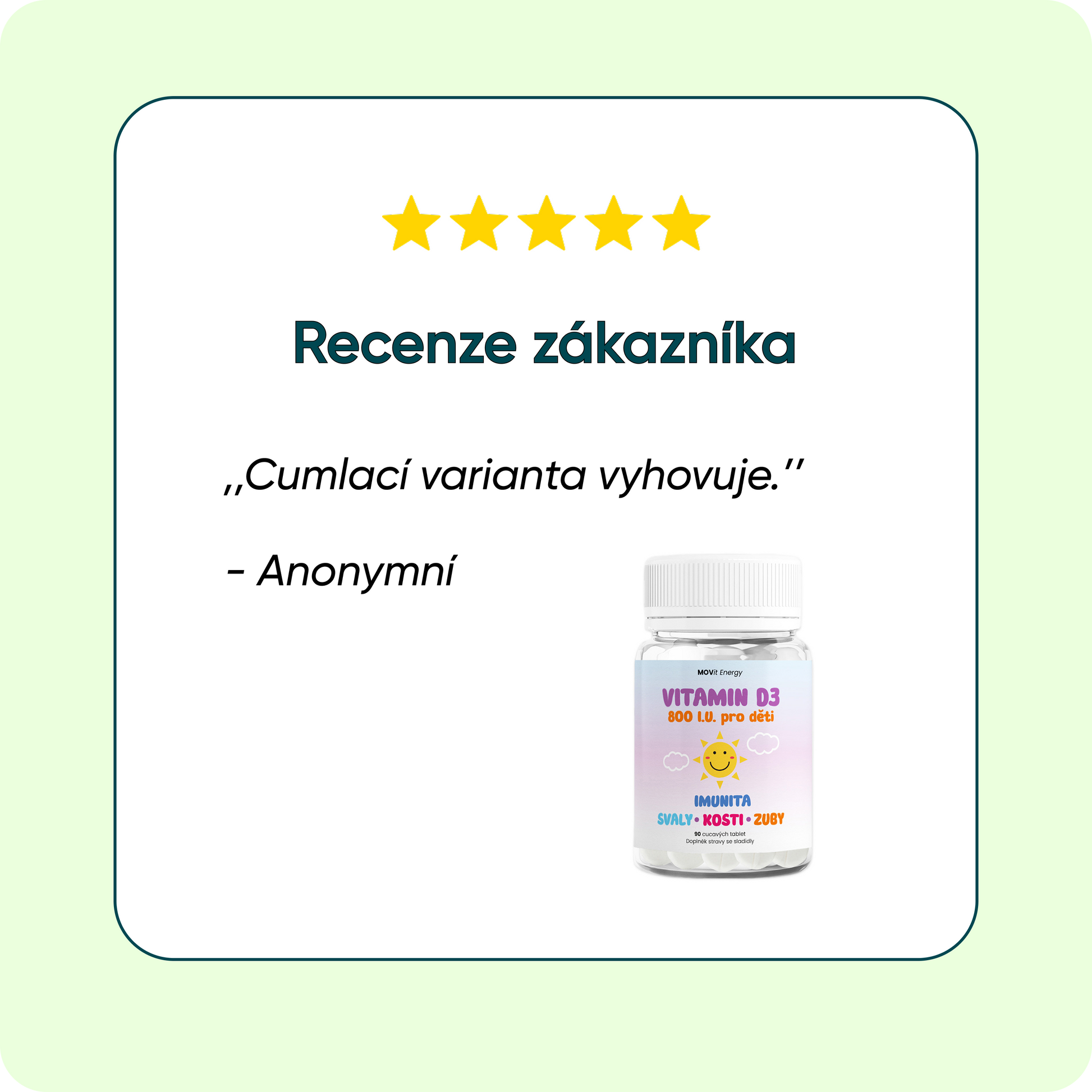 MOVit vitamin D3 800 I.U. ve formě chutných cucacích tablet je výborná volba pro doplnění velmi důležitého vitamínu D především dětem, ale i dospělým, zejména v obdobích nízké expozice slunečního záření a zvýšeného výskytu nakažlivých infekčních onemocnění.